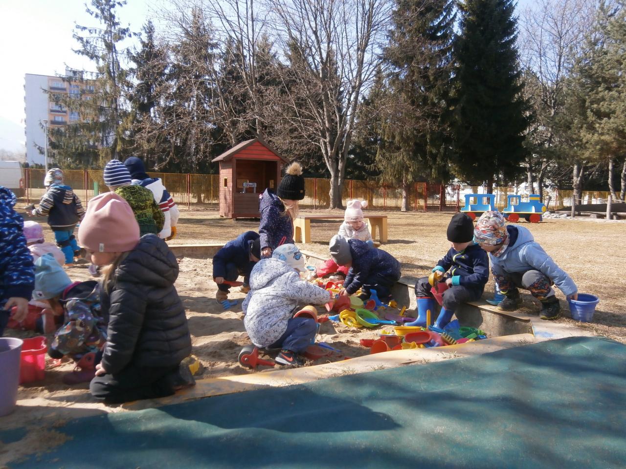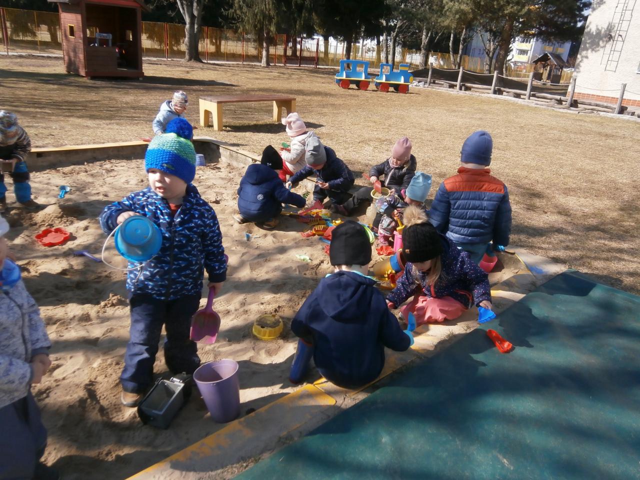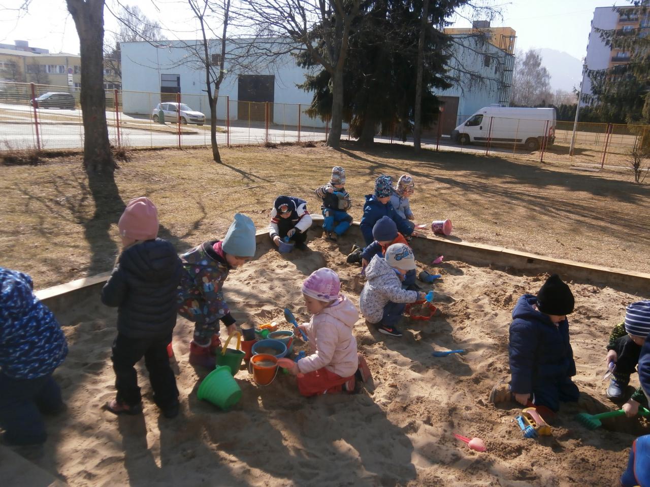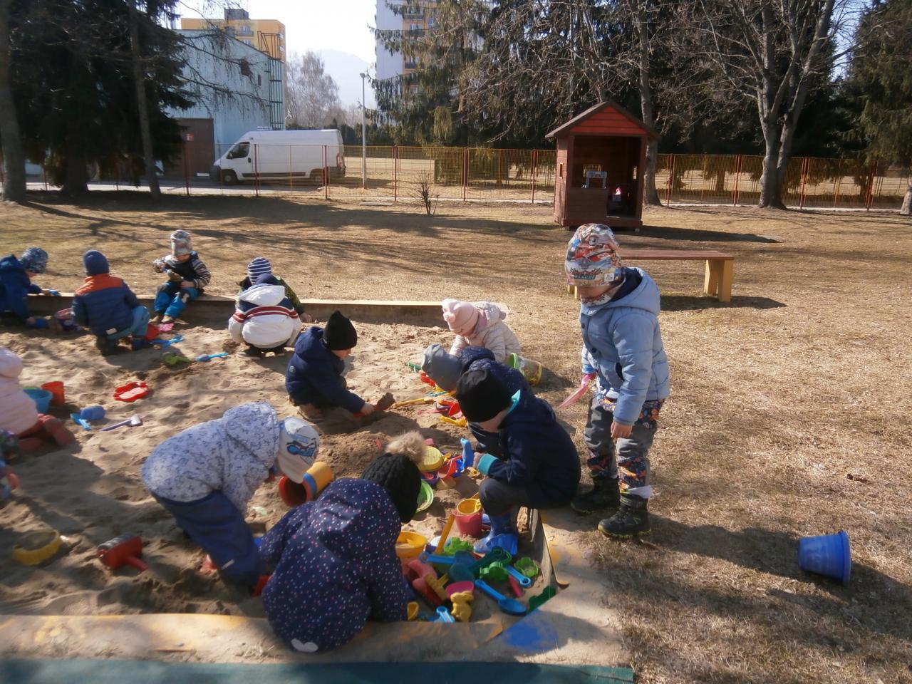Kýblik, malá formička, lopatka i hrablička. Všetci sme si pomáhali, naberali, presýpali. Do úst piesok nedávali, tunel sme si vystavali.