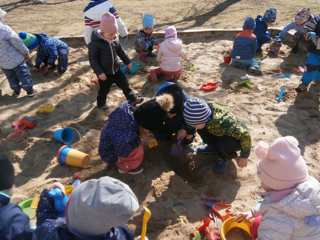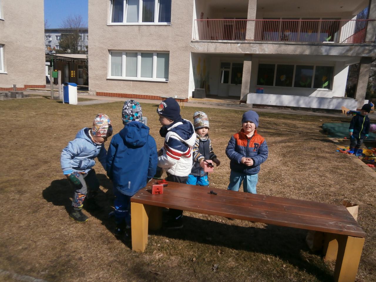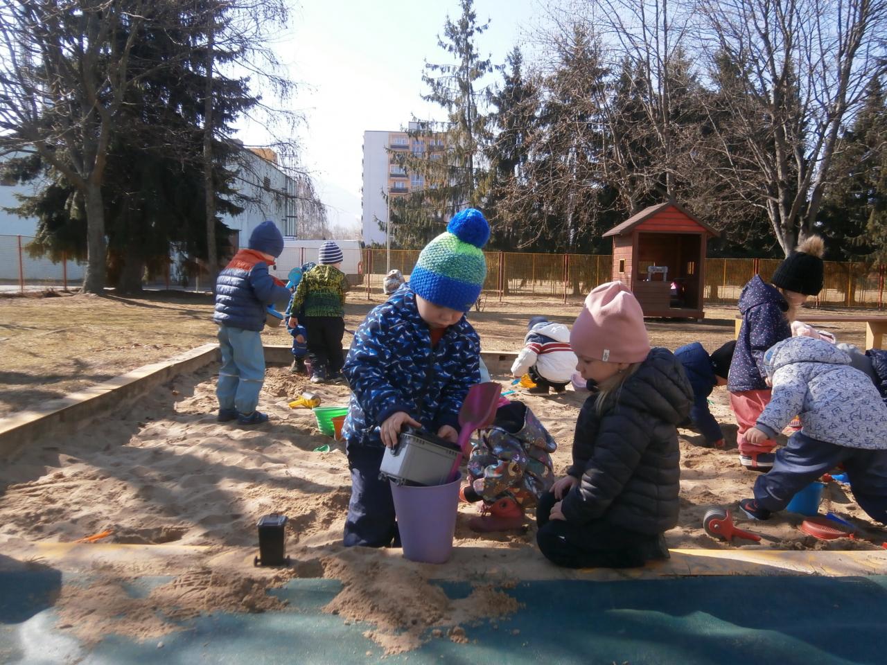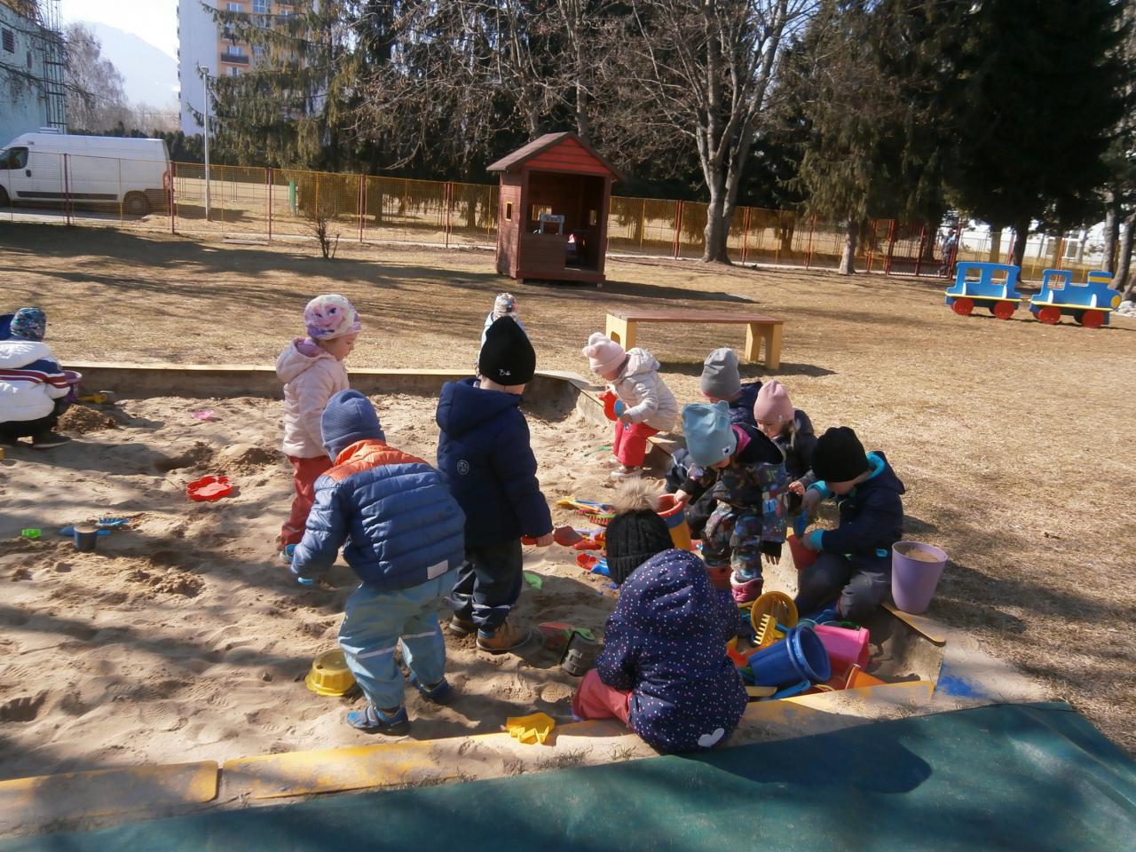 Kýblik, malá formička, lopatka i hrablička. Všetci sme si pomáhali, naberali, presýpali. Do úst piesok nedávali, tunel sme si vystavali.