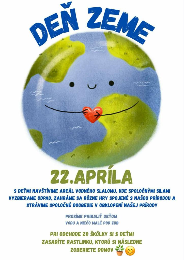 Aj naša MŠ si pripomenie Deň Zeme a to prostredníctvom akcie na Areáli vodného slalomu Ondreja Cibáka 22.04.2026 v dopoludňajších hodinách. Zameriame sa na zbieranie odpadu v okolí Areálu vodného slalomu a hranie hier súvisiacich s prírodou.